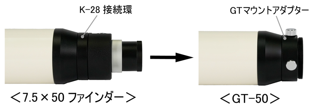 7.5×50ファインダーをお持ちの場合、ファインダー接眼ユニットをGTマウントアダプターに交換する事でGT-50と同仕様にてご使用いただけます。
